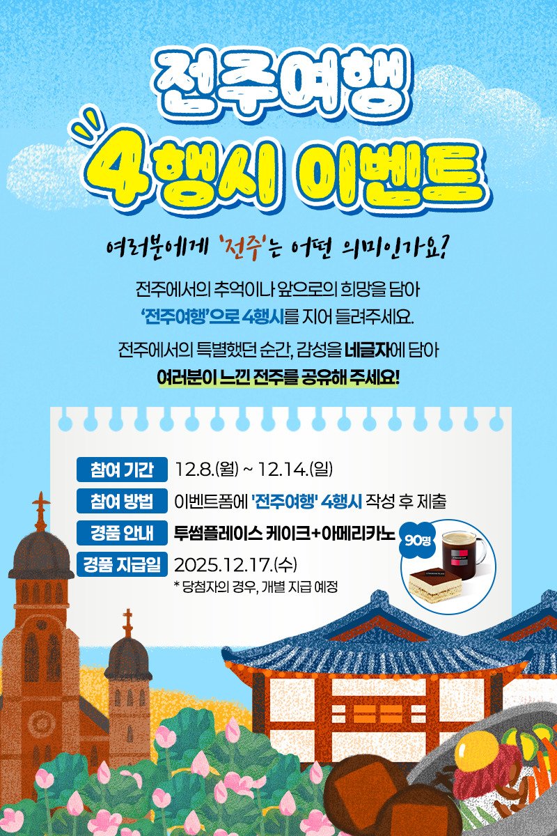 참여 방법 : 이벤트폼에 '전주여행' 4행시 작성 후 제출