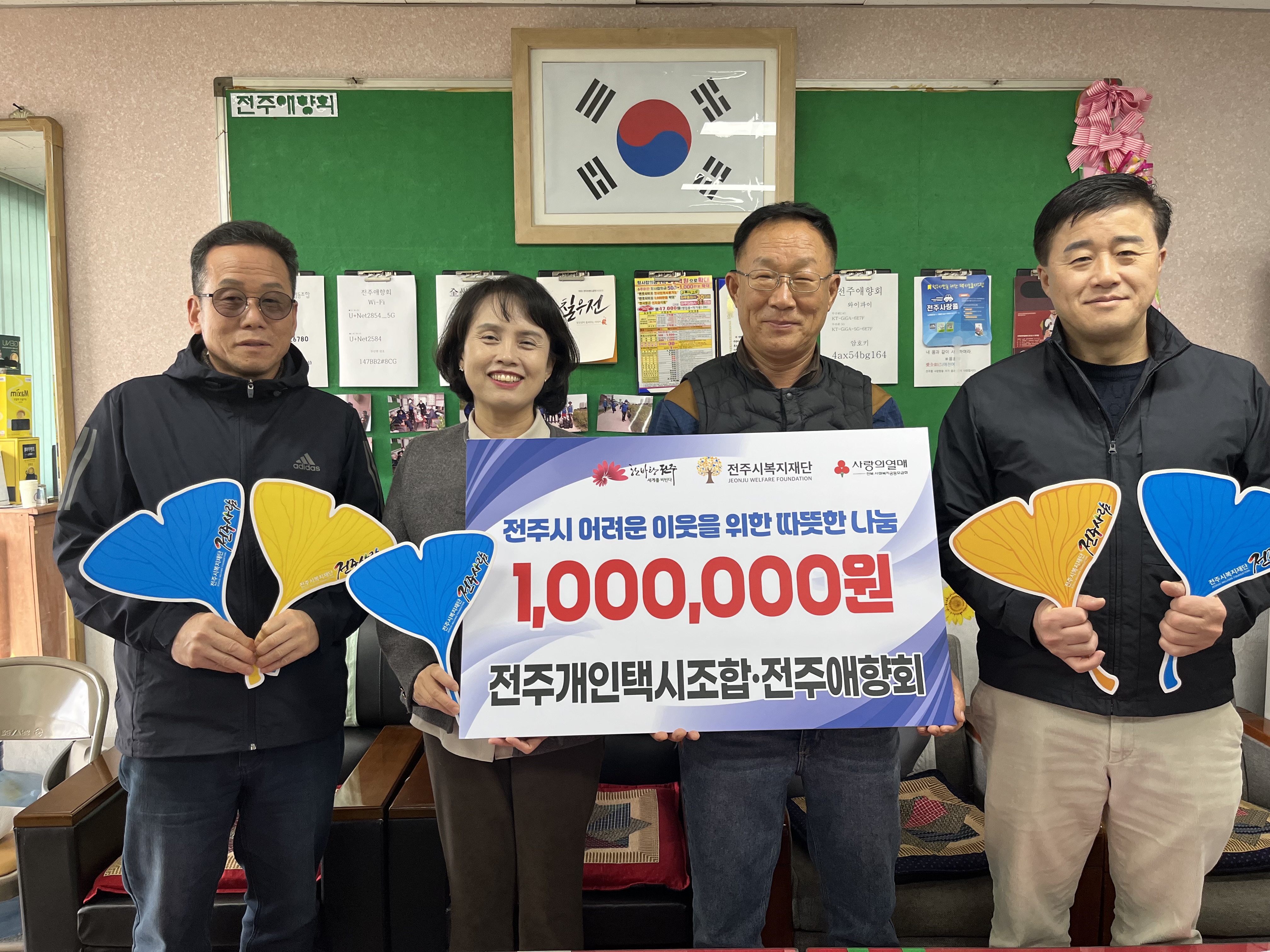 이번 성금은 전주개인택시조합 소속 애향회 회원 100여 명이 전주를 사랑하는 마음으로 뜻을 모아 마련한 것으로, 지역사회 이웃 돕기에 사용될 예정입니다.