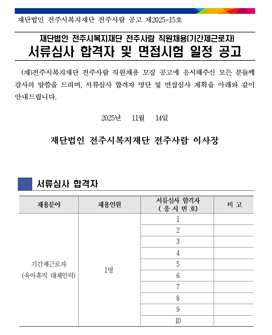 2025년 제3회 직원채용(기간제근로자-육아휴직 대체인력)서류심사 합격자 및 면접시험 일정 공고