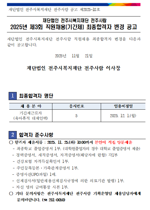 2025년 제3회 직원채용 최종합격자(기간제근로자) 변경 공고